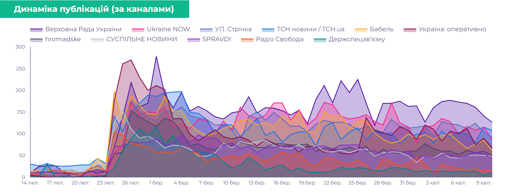 До початку повномасштабної війни в Україні найбільш активно поширював повідомлення канал ТСН новини / TCH.ua — 25-43 повідомлення на день протягом 14-23 лютого. Однак після 24-го він перестав бути таким явним лідером за кількістю новин. Після повномасштабного вторгнення Росії найбільш активно публікувати інформацію почали Верховна Рада України, Ukraine NOW, УП. Стрічка, ТСН новини / TCH.ua, Бабель.